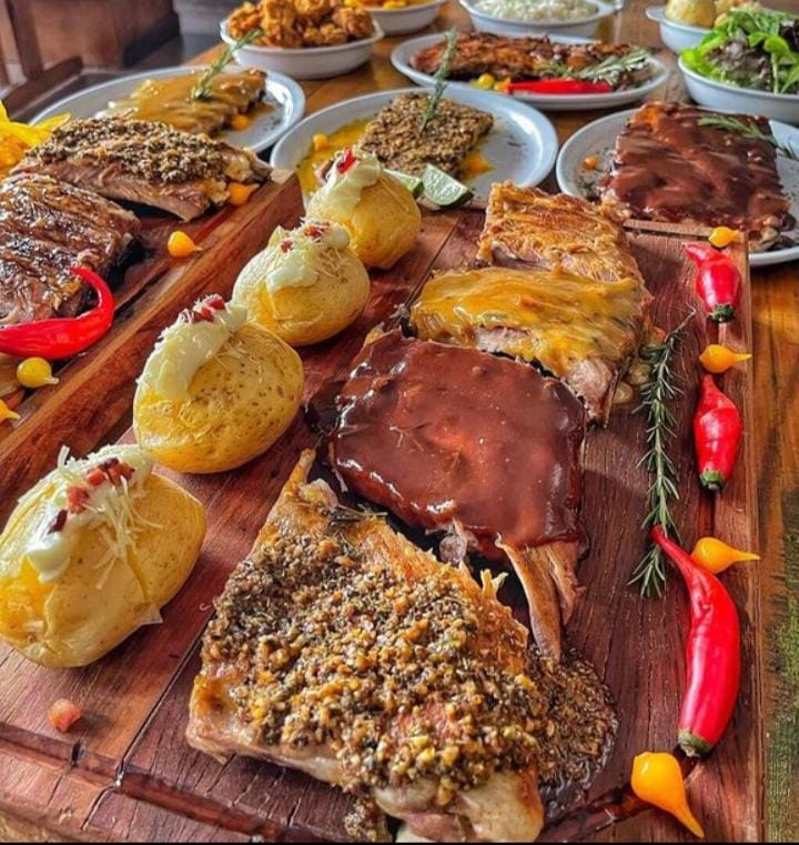Além do carro-chefe da casa, o rodízio inclui frango a passarinho desossado, arroz temperado, batata rústica da casa, batata recheada com queijo cremoso e bacon, e uma salada de mix de folhas, tudo à vontade!